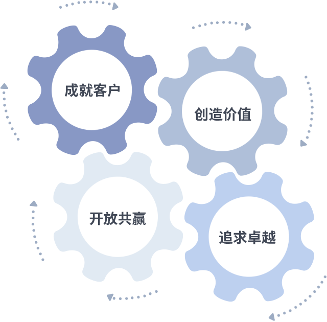 成就客户是一切决策的出发点,创造价值是衡量所有工作的标准,追求卓越是人生就是博尊龙做事做人的态度,开放共赢是人生就是博尊龙的格局也是最终的结果。价值观的齿轮环环相扣,推动着组织里的每个人不断向前。
